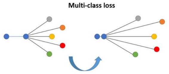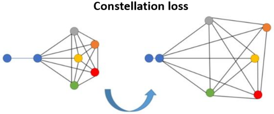 La perte par constellation prend le meilleur de la loss par triplet et la loss N-pair multiclasses. Elle utilise la même construction de lot que la triplet loss, et une formulation similaire à la N-pair multiclasses. L’hyperparamètre K définit le nombre de triplets incorporés, permettant de prendre en compte plus de termes négatifs qu’avec la loss triplet standard. Même si augmenter K implique plus de calculs, il a été prouvé que dans certains cas, augmenter K n’affecte plus les résultats à partir d’un certain seuil, notamment en raison du caractère aléatoire du choix des négatifs. La principale différence : la N-pair multiclasses soustrait les produits scalaires des paires de même classe, tandis que la constellation loss soustrait le produit scalaire entre une ancre et un négatif, et celui entre une ancre et un positif.