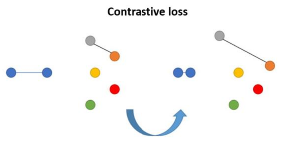 L’idée principale de l’apprentissage contrastif est d’apprendre des représentations (espace d’intégration) telles que les échantillons similaires restent proches les uns des autres, tandis que les échantillons dissemblables sont éloignés. L’apprentissage contrastif peut être appliqué à des contextes supervisés et non supervisés. Lorsqu’on travaille avec des données non supervisées, l’apprentissage contrastif est l’une des approches les plus intéressantes. Il a été démontré qu’il permettait d’obtenir de bonnes performances dans une variété de tâches de vision et de langage. Pour réaliser cet apprentissage, on a recours à des fonctions de pertes spécifiques.