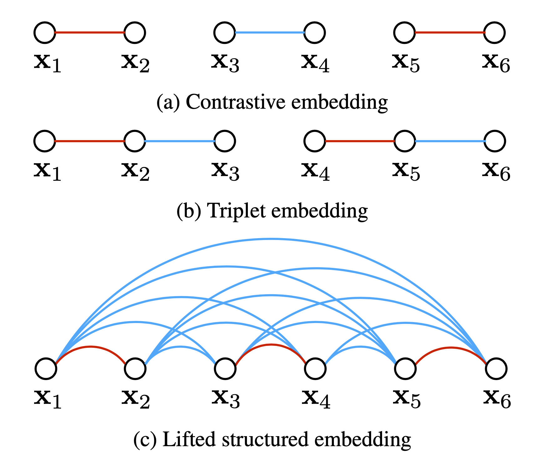 Lifted Structured Loss (Song et al. 2015) utilise toutes les paires d’arêtes dans un lot (batch) pour une meilleure efficacité computationnelle (temps et erreur).