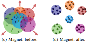 La fonction de perte Magnet a été proposée dans Metric Learning with Adaptive Density Discrimination. Au lieu d’opérer sur des individus, des paires ou des triplets de données, Magnet Loss fonctionne sur des régions entières de l’espace d’intégration occupées par les points de données. La fonction modélise les distributions des différentes classes dans cet espace et s’efforce de réduire le chevauchement entre ces distributions.