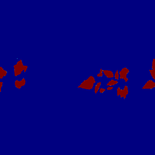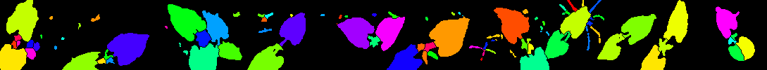 Dans l'équation ci-dessus, les poids $W$ ont été empiriquement fixés à $[0.263, 0.790, 0.132, 0.079]$. Cela signifie que la deuxième classe (bords intérieurs) est prioritaire (pour séparer l'instance intérieure). Ensuite, ce sont les bords extérieurs qui permettent de séparer les "grandes" feuilles en petites et fines feuilles. Enfin, ce sont les feuilles fines (principalement le mélange spectral) et les grandes feuilles intérieures (essentiellement la végétation moins les limites) qui devraient être plus faciles à apprendre.