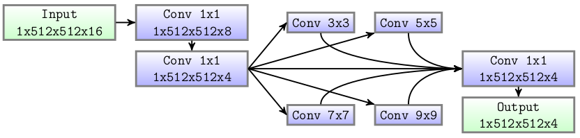 Classification et sortie auxiliaire La classification est effectuée par un petit réseau composé de deux couches de convolution $1\times1$. Suivi d'un ``Module de mise en commun pyramidale'' pour considérer les différentes échelles avant les sorties et lisser la prédiction des limites. Zhao2017 a montré que la fusion des caractéristiques de bas et haut niveau améliorait la tâche de segmentation. Elle consiste en la somme de différentes convolutions 2D dont la taille des noyaux a été fixée à 3, 5, 7 et 9. Le nombre de filtres est le même que le nombre de classes, soit 4$. Le résultat de chaque convolution est concaténé et l'image finale est donnée par une convolution 2D. De plus, toutes les convolutions sont suivies d'une normalisation par lots et d'une fonction d'activation sigmoïde. La figure ci-dessous montre ce petit réseau.