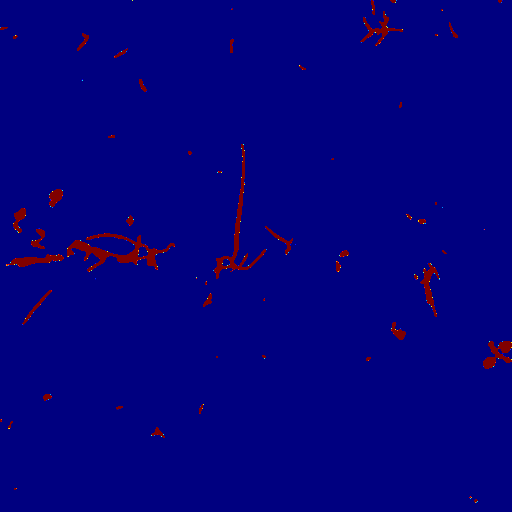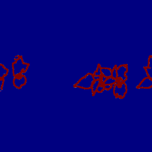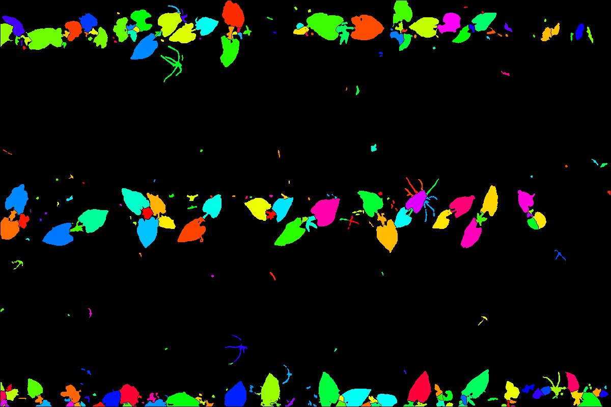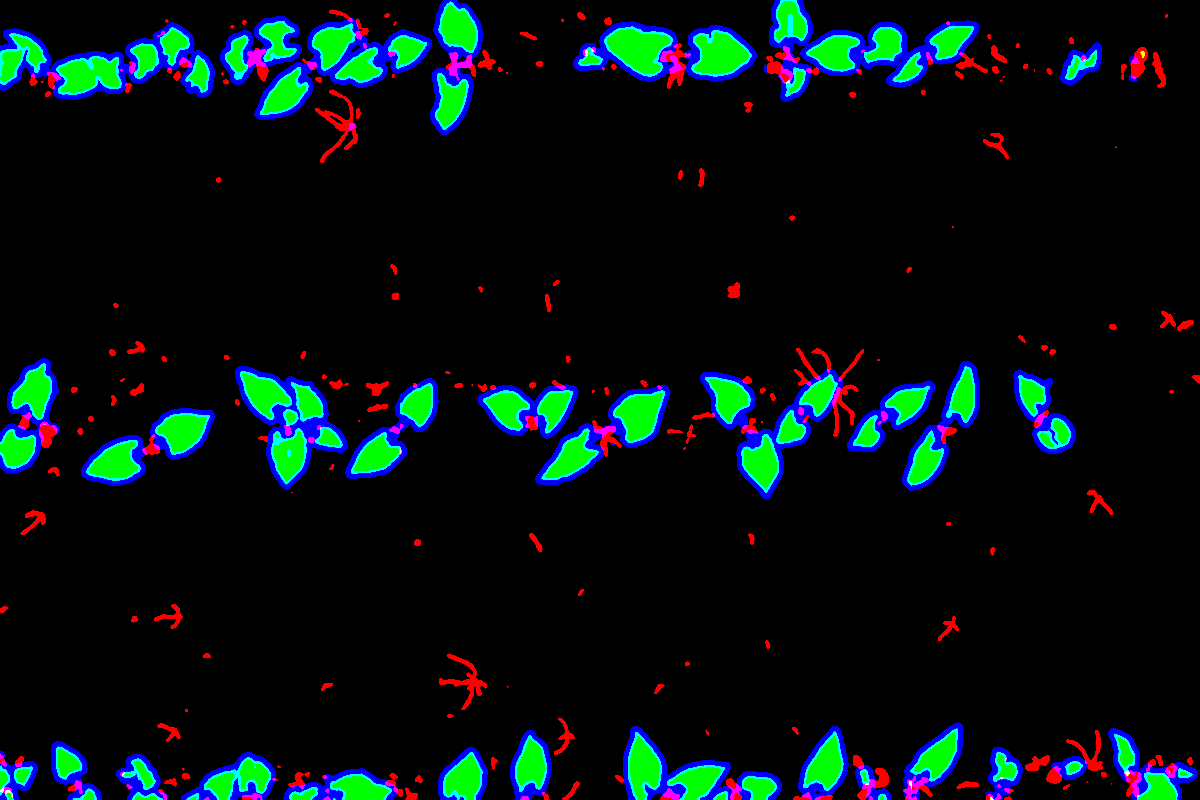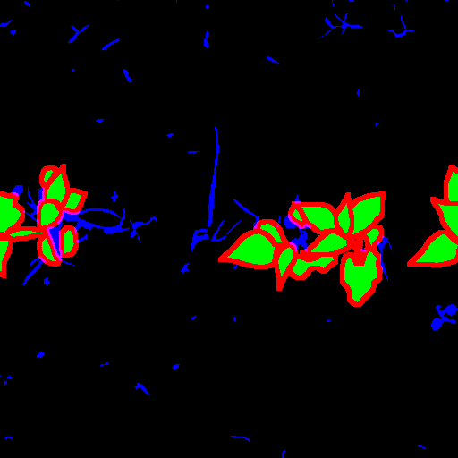 La vérité terrain est définie par des experts avec des polygones autour de chaque feuille. De plus, les polygones contiennent une étiquette pour leur classification entre culture et adventice (non utilisée dans cette étude). L'annotation a été définie à l'aide du logiciel d'annotation VIA et un total de 300 images de haricots ont été annotées, 170 en juin et 130 en octobre. Les données sont disponible ici https://entrepot.recherche.data.gouv.fr/. Étant donné que la méthode proposé repose sur une segmentation semantique, la vérité terrain a été transformé en masque de segmentation. Ainsi les polygones défini sont "dessiné dans une image. De plus, les polygones permettent de manipulé les zones d'incertitudes, l'épaisseur, ... etc. Dans cette étude, nous avons défini 4 classes, les petites feuilles (bleu), le contour des grande feuilles (rouge), l'intérieur des grandes feuilles (vert) et le background (noire) telque visible ci-dessous :