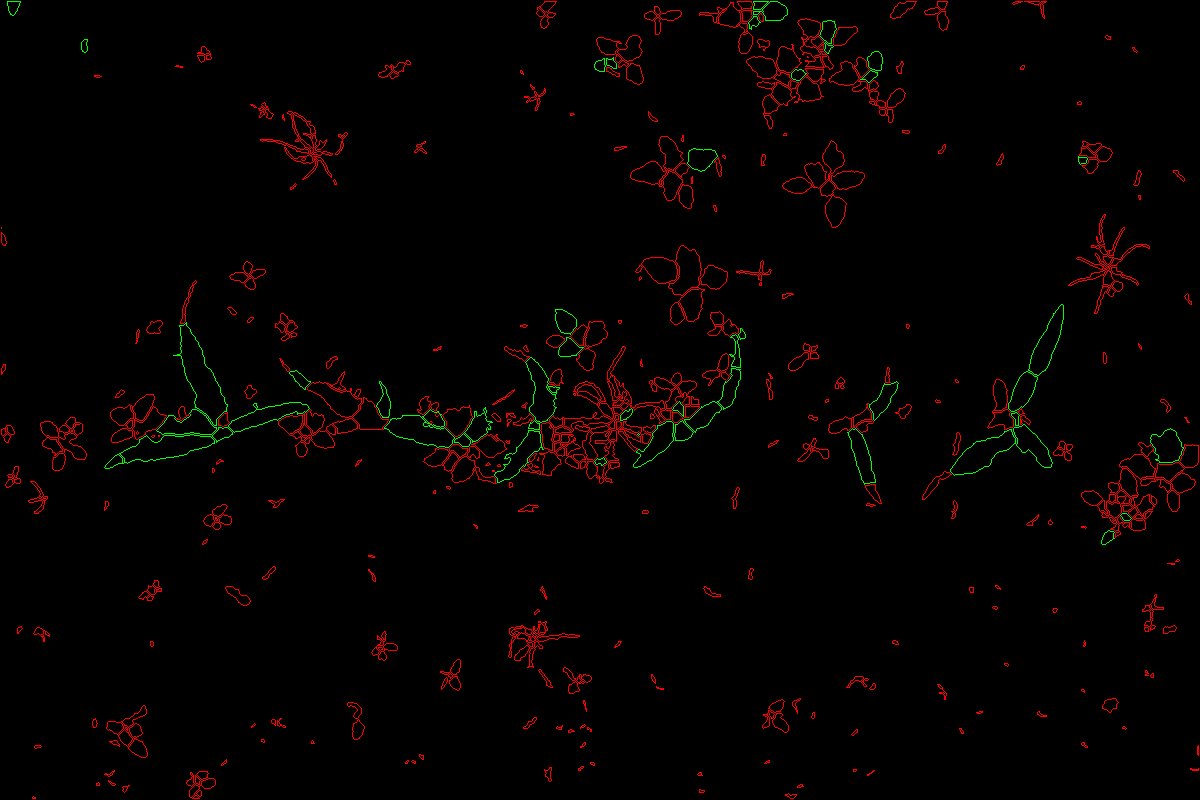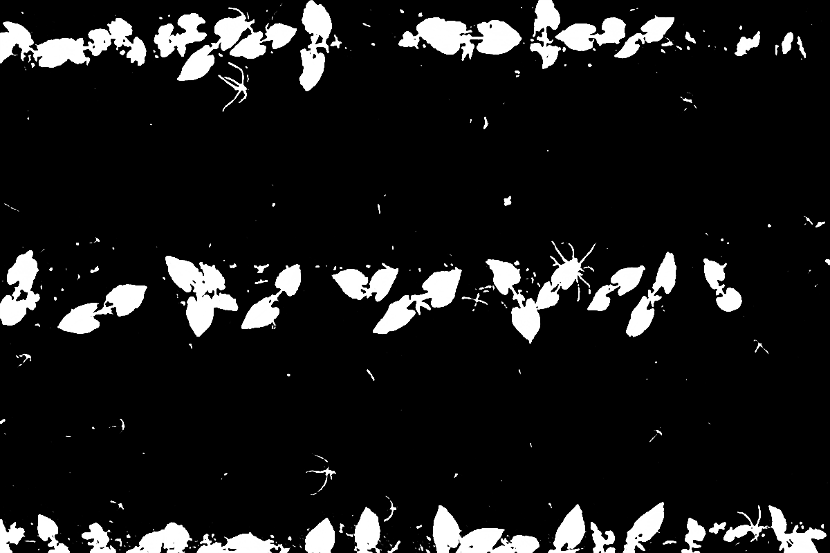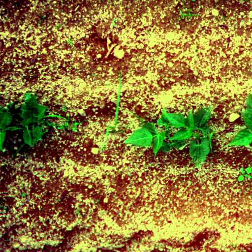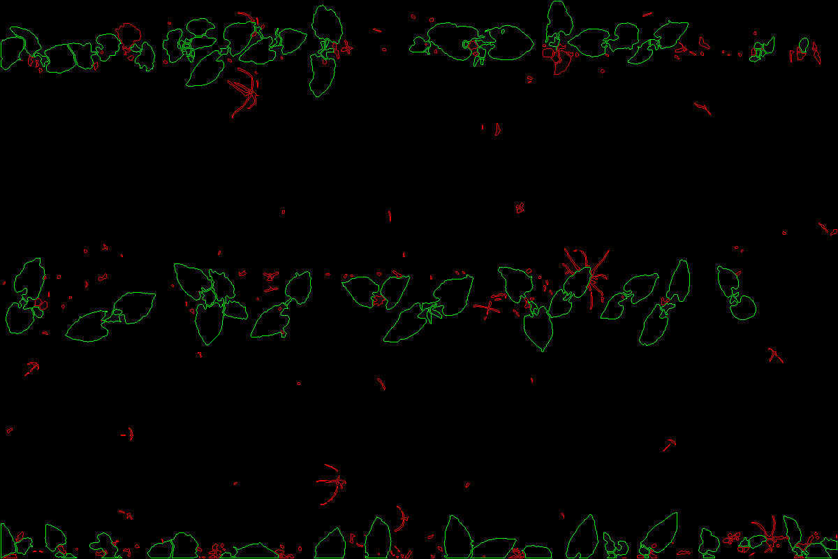 A titre d'illustration, dans le cadre du challenge RoSE, l'idée est de séparer les cultures des advantices pour appliqué un traitement différencié. Grace à la segmentation, de nombreuses propriétés peuvent être extractes sur chaques feuilles permettant de crée un modèle de classification culture/advantice. Ces travaux seront décris plus tard. Ci-dessous, deux modèles permettent la discrimination dans des lignes de maïs, puis des lignes de haricot. Le taux de discrimination avoisine les 91.2%