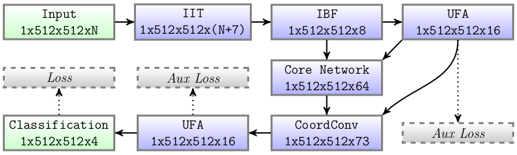 Contrairement aux architectures CNN récentes, l'approche proposée est légèrement plus décomposée comme les pipelines de vision informatique biomédicaux et agricoles standard Perez-Sanz-2017. Ainsi, l'architecture est composée de 3 modules amont (IIT, IBF, UFA) qui améliorent les données d'entrée et éliminent les informations inutiles, ces étapes ont été proposées dans un travail précédent pour reconstruire un indice de végétation. Ici, ces étapes sont utilisées pour apprendre des caractéristiques spectrales complexes sur les données d'entrée afin d'exploiter les relations inter-canaux. Après ces étapes, un core network est utilisé pour considérer les informations spatiales à différentes échelles sur l'image, le core network renvoie 4 cartes de caractéristiques réduites. Enfin, 3 modules en aval (CoordConv, UFA, Classification) sont placés à la fin du réseau pour bien mélanger les informations spectrales et spatiales. La fonction d'activation sigmoïde est utilisée à la fin de toutes les couches de convolution pour apprendre des structures plus complexes et permet la non-linéarité de la fonction reconstruite. La synthèse du réseau est visible ci-dessous :