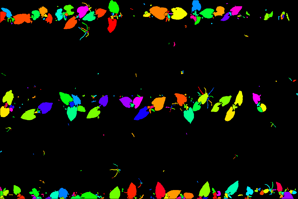 Le réseau proposé génère 4 classes. Les deux premières sont associées aux limites des "grandes" feuilles (notées $Edges=Outer+Inner$). La troisième est celle des feuilles petites et fines (notée $Thin$), et la quatrième est celle de l'intérieur des grandes feuilles notée $Big$. Le watershed est également initialiser avec des "Seed" qui ont été définie avec l'équation suivante pour générer le masque de la graine : $Seed = Thin + Big - Edges$