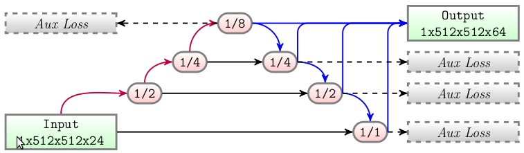L'architecture CNN proposée est basée sur une architecture U-Net avancée appelée MFP-Unet (multi-feature pyramid U-net) proposée par moradi2019mfp. Il s'agit d'un réseau neuronal composé de plusieurs couches de convolution 2d entre différentes sous-échelles (comme une petite UFA). À chaque sous-échelle, la taille spatiale est divisée par deux et le nombre de filtres est multiplié par deux. Les sous-échelles sont obtenues par des couches de Max-Pooling, puis pour retrouver la taille originale, une couche d'UpSampling 2D est utilisée. L'architecture U-Net étant devenue très populaire, nous ne la présentons pas en détail. Dans cette étude, la profondeur du modèle U-Net est fixée à 3 down-scale (taille 512, 256, 128, 64). La spécificité de MFP-Unet est que toutes les cartes de caractéristiques de sous-échelle sont directement échantillonnées à la taille initiale, concaténées au canal et ensuite utilisées pour la classification (Figure ci-dessous). En outre, selon Morris2018, des fonctions de perte auxiliaires sont placées dans chaque couche de caractéristiques de sous-échelle et sont appliquées pour apprendre les bords à différentes échelles, rendant le réseau plus robuste à la résolution spatiale. Les pertes à chaque prédiction raccourcissent également le chemin de rétropropagation, ce qui permet une convergence plus rapide. Toutes les couches de convolution utilisent un noyau de $3\times3$ et sont suivies d'une normalisation par lots et d'une fonction d'activation sigmoïde.