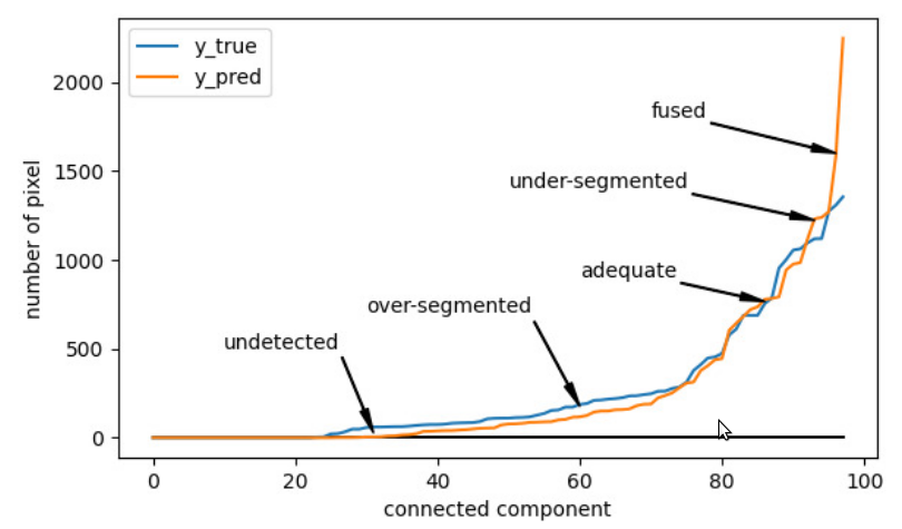 Dans l'équation ci-dessus, $N$ est le nombre de composantes, $cc_i(p)$ et $cc_i(\hat{p})$ sont respectivement le nombre de pixels d'une composante connectée dans la vérité terrain et sur la segmentation prédite dans l'histogramme trié. Alors que $cc_{max}(p)$ est le nombre maximum de pixels d'une composante dans la vérité terrain. Le leaky_relu a été utilisé pour donner explicitement la priorité à l'apprentissage sur la sous-segmentation plutôt que sur la sur-segmentation, ce qui permet de travailler d'abord sur les objets fusionnés. Ceci a été défini parce que les fonctions de pertes conventionnelles ne donnaient pas de bons résultats dans une couverture végétale dense, entraînant la segmentation et la détection d'une large zone comme une seule entité. Pour autant que nous le sachions, c'est la première étude qui propose ce type de perte.
