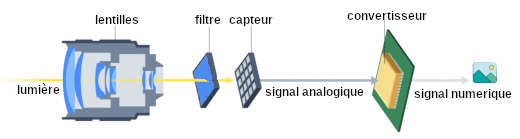 Pour acquérir une image, on peut utiliser un capteur CCD (Charge-Coupled Device) ou un CMOS (Complementary Metal Oxide Semiconductor). Ces éléments sont composés d’une matrice de photosites (semi-conducteurs photosensibles). Ces derniers convertissent l’information lumineuse reçue en tension électrique (analogique) exprimée en volts, puis en un nombre entier à travers un convertisseur analogique-numérique (CAN). Notons que les valeurs numériques ont une précision limitée, c’est-à-dire que l’information est encodée sur un nombre de bits fixe. Avant d’arriver à la matrice de détection, la lumière passe par un système optique, composé d’une ou plusieurs lentilles et d’un filtre pour limiter la plage d’intégration (visible), tel que représenté ci-dessous :